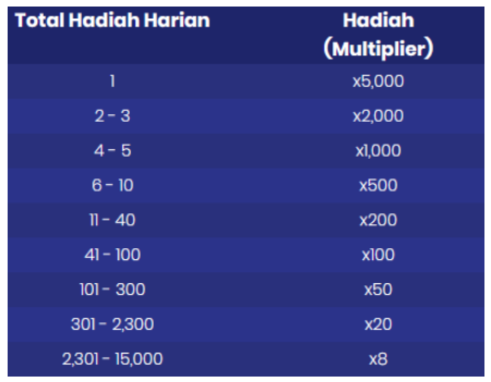 7. Pemain akan memenangkan hadiah berupa multiplier dari jumlah taruhan seperti yang tertera di Tabel hadiah.